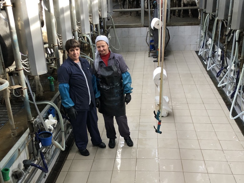 В корпусе чисто. Вода для подмыва вымени с температурой тела животного подается непосредственно в доильную установку. Доярки трудятся в специальных перчатках, молоко по молокопроводу поступает в закрытые резервуары, что позволяет избавиться от его загрязнения.