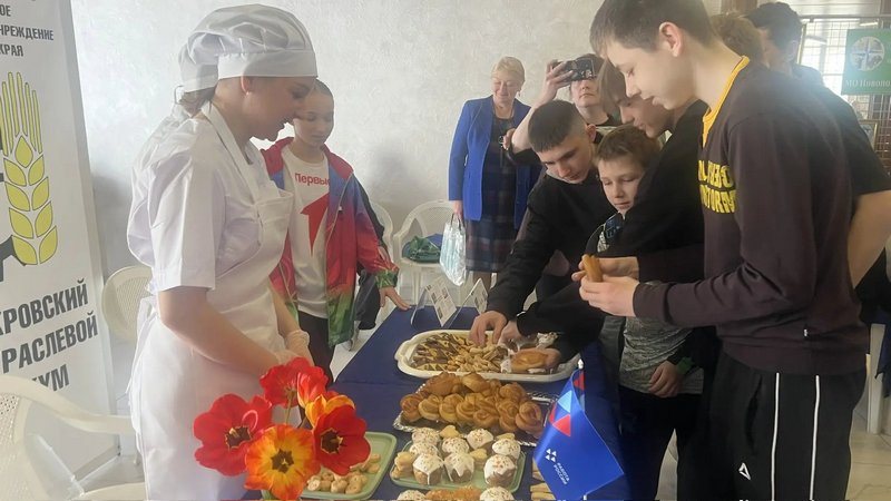 Многолюдно было и у стенда Новопокровского многоотраслевого техникума. Студентки первого курса специальности «Аппаратчик-оператор производства продуктов питания из растительного сырья» Виктория Тищенко и Екатерина Воронова не только презентовали ароматную выпечку, но и интересно рассказывали подросткам о своей будущей профессии, о перспективах, техникуме и о том, какие шикарные мастерские сейчас в учебном заведении.