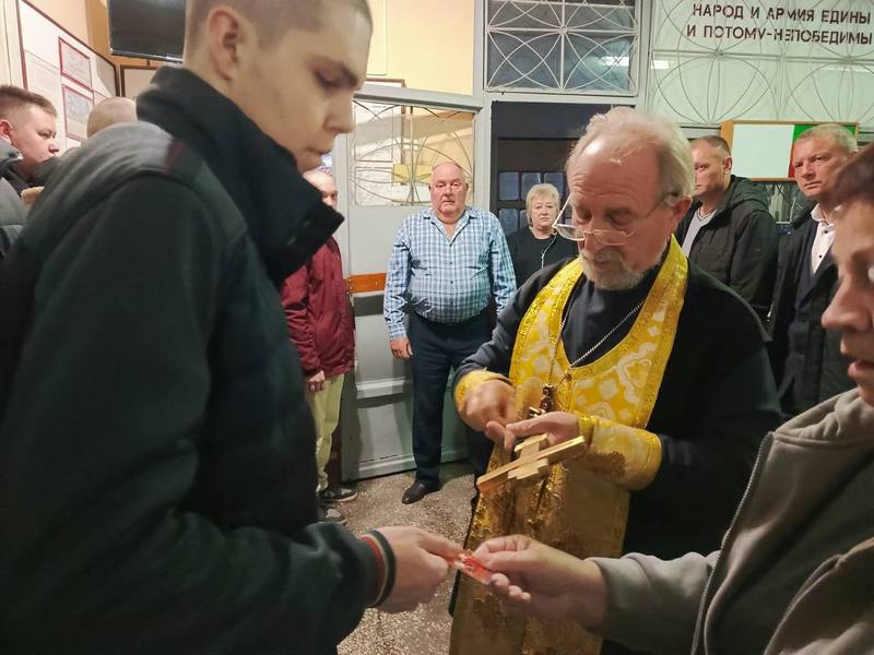 Настоятель новопокровского храма Пресвятой Богородицы Николай Мартынюк отслужил молебен, благословил будущих защитников на ратную службу, каждому вручил икону и нательный крестик. Также он рассказал о православном празднике Покров Пресвятой Богородицы и силе веры.