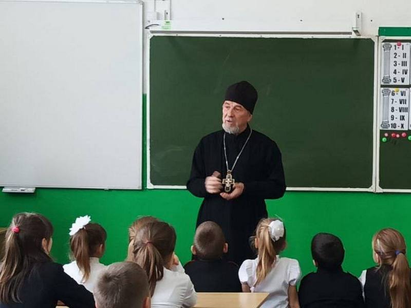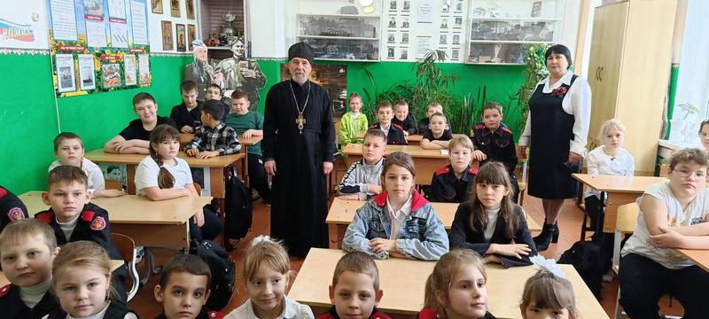 Сегодня в казачьей школе № 7 поселка Малокубанского состоялась встреча с настоятелем храма Рождества Пресвятой Богородицы станицы Новопокровской отцом Николаем.
