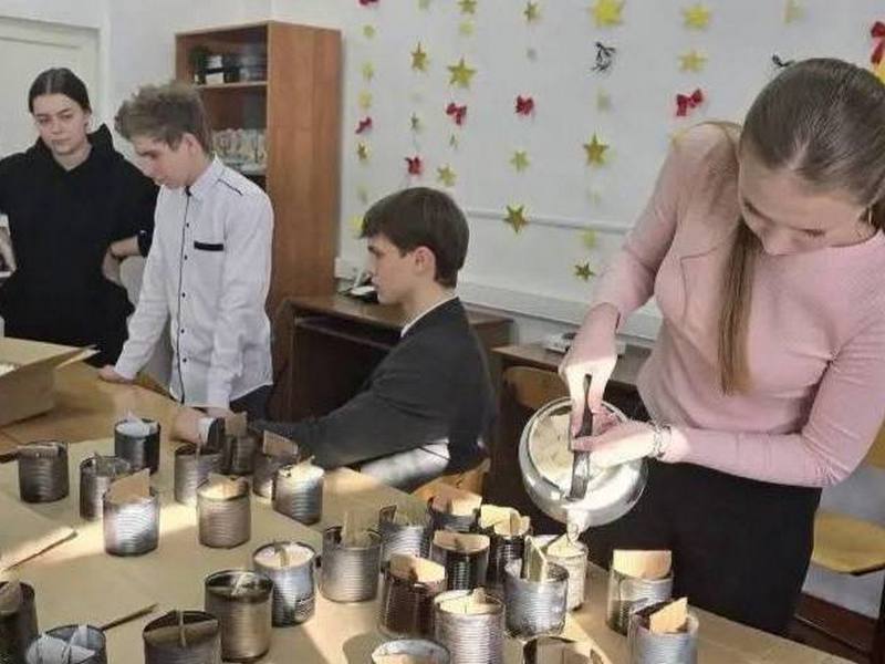 Учащиеся с педагогами СОШ №16 станицы Ильинской изготавливают окопные свечи для тех, кто сейчас на передовой.