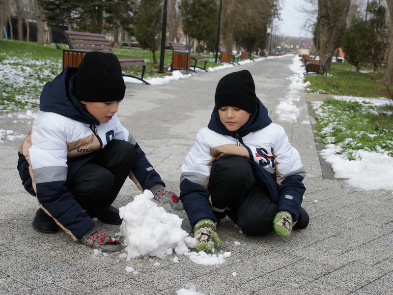 Восьмилетние братья всегда ждут зиму. И когда выпал первый (и мальчики надеются, не последний) кубанский снег, они вышли с родителями в парк на прогулку. Снег дружно собирали по всему парку. Хватило на одного маленького снеговика.