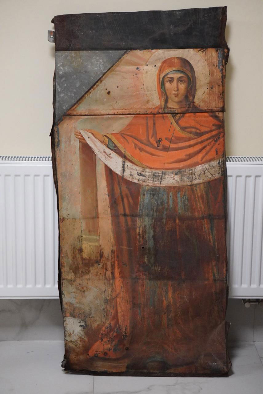 Старинная икона Покрова Божией Матери, найденная на кровле спортивной школы. / Фото К. Виеру