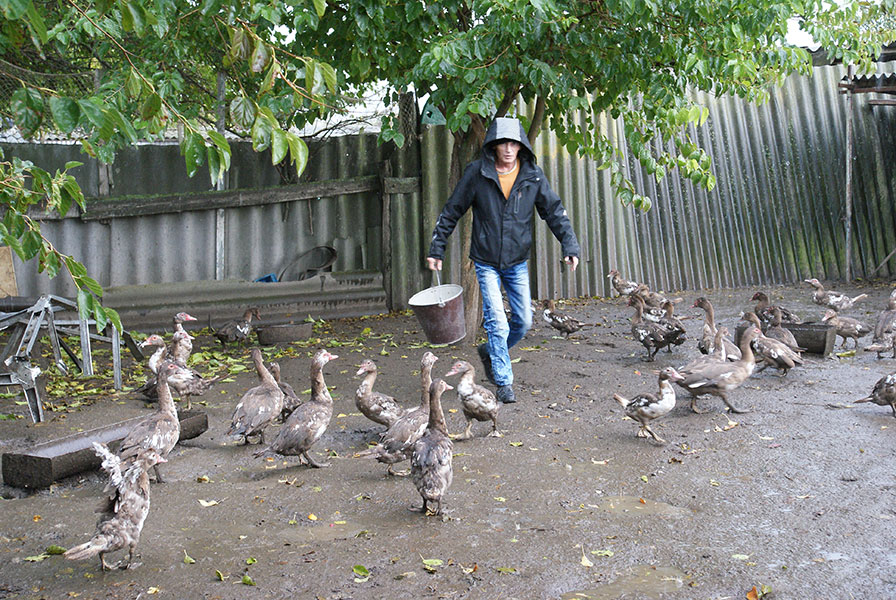Продолжаем движение по намеченному маршруту, и асфальтированная дорога улицы Веселой приводит нас к дому Владимира Иванова. Назойливый дождь не утихает, и хозяин приглашает укрыться под навесом. Из глубины двора доносится «кря-кря» – привычный звук сельской жизни.