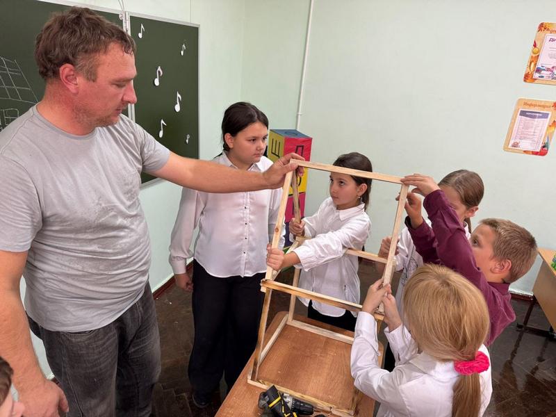 Вместе со строителем Валентином Савченко ученики СОШ № 3 мастерили кормушку для птиц. / Фото с ТГ-канала СОШ № 3