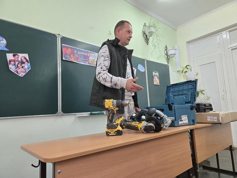 Роман Дорофеев показал школьникам, какие инструменты нужны в строительных работах. / Фото с ТГ-канала СОШ № 3